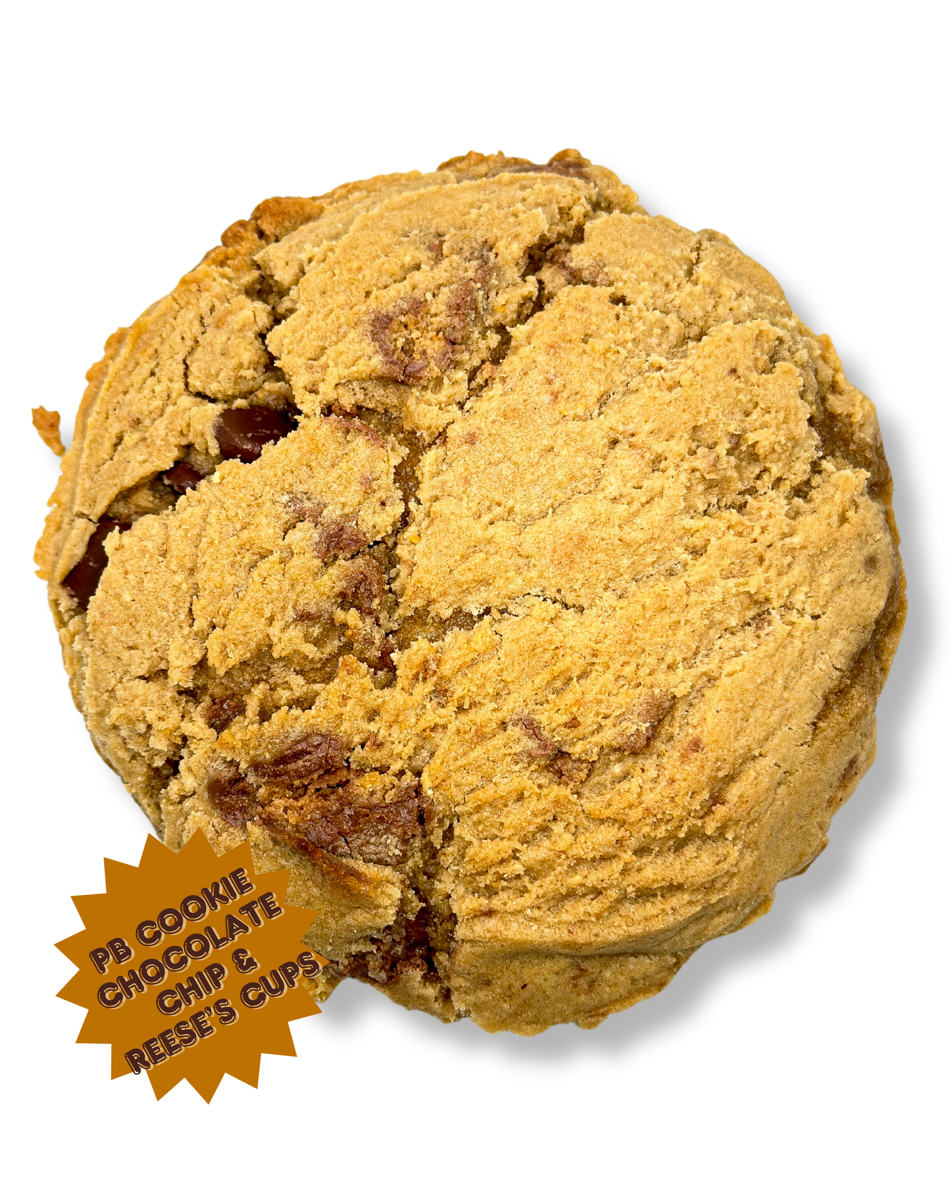 A rich, buttery peanut butter cookie base, generously studded with chunks of Reese's Peanut Butter Cups and semi-sweet chocolate chips.